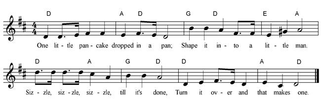 One little pancake dropped in a pan, Shape it into a little man, Sizzle, sizzle, sizzle till it’s done, Turn it over and that makes one. Another little pancake dropped in a pan, Shape it into a little man, Sizzle, sizzle, sizzle, it’s for you, Turn it over and that makes two. Another little pancake dropped in a pan, Shape it into a little man, Sizzle, sizzle, sizzle, it’s for me, Turn it over and that makes three. Another little pancake dropped in a pan, Shape it into a little man, Sizzle, sizzle, sizzle, lots make more, Turn it over and that makes four. Another little pancake dropped in a pan, Shape it into a little man, Sizzle, sizzle, sizzle, it looks alive, Turn it over and that makes five. Five little pancakes, what a treat! Covered in jam and ready to eat. Gobble, gobble, munch, munch, yummy, yum, yum, Five little pancakes in my tum. |
