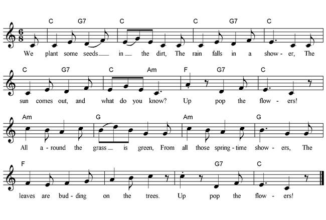 Up come the flowers, Out comes the sun, Hear the bees a-buzzing; Springtime has begun! Up in the treetops, The birds are all here, Now we know it's
