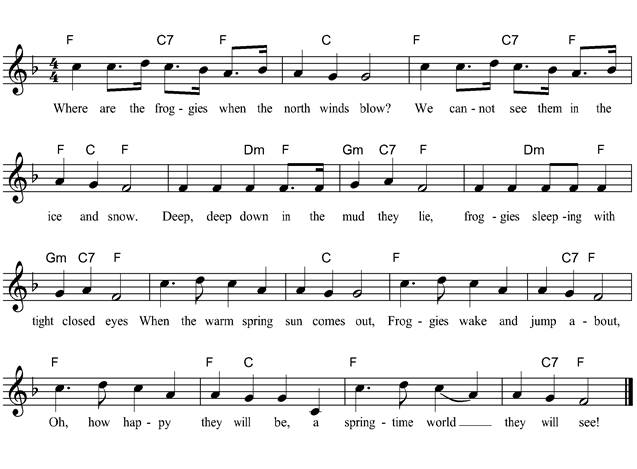 will see! Where are the squirrels when the north winds blow? We cannot see them in the ice and snow. Cracking nuts in a hollow tree, Squirrels are cozy as cozy can be. When the warm spring sun comes out, Squirrels wake and jump about. Oh, how happy they will be, A spring-time world they