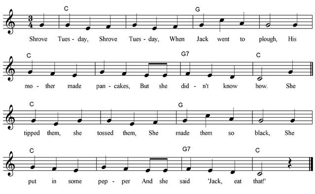 Shrove Tuesday, Shrove Tuesday, When Jack went to plough, His mother made pancakes, But she didn't know how. She tipped them, she tossed them, She made them so black, She put in some pepper And she said, ‘Jack, eat that!’ Jack’s father made pudding, ‘Twas done in an hour, He hadn’t got eggs And he hadn’t got flour. He hadn’t got figs And he hadn’t got fat. He dropped it on the table And he said, ‘Jack, eat that!’ Shrove Tuesday, Ash Wednesday, Jack’s father went to plough, His sister made pancakes, But she didn't know how. She buttered them, she sugared them, She burnt them so black, She made them so awful That she poisoned poor Jack! |