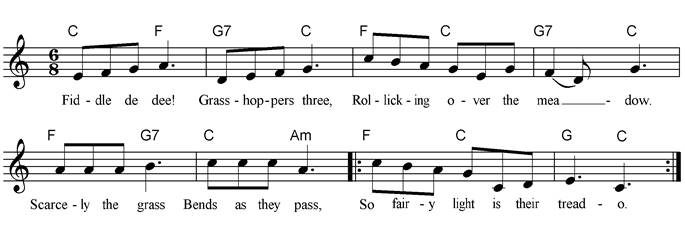Fiddle de dee! Grasshoppers three, Rollicking over the meadow. Scarcely the grass Bends as they pass, So fairy light is their tread-o. Said Grasshopper one The summer's begun, This sunshine is driving me crazy. Said grasshopper two I feel just like you, And leapt to the top of a daisy. Please wait for me Cried Grasshopper three, My legs are ready for hopping. So Grasshoppers three, Fiddle de dee, Raced all the day without stopping! |