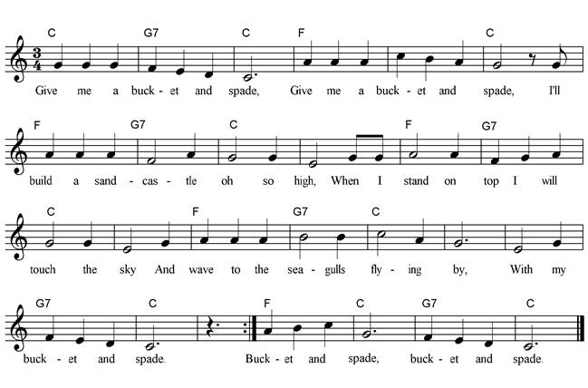 Give me a bucket and spade, Give me a bucket and spade, I'll build a sandcastle oh so high, When I stand on top I will touch the sky And wave to the seagulls flying by, With my bucket and spade. Bucket and spade, Bucket and spade! Give me a bucket and spade, Give me a bucket and spade, I'll dig and dig and never drop, When I reach Australia then I'll stop, Then like the kangaroo see me hop, With my bucket and spade. Bucket and spade, Bucket and spade! Give me a bucket and spade, Give me a bucket and spade, I'll stand and stare at the roaring sea, ‘Til the setting sun tells me time for tea, I'll be back tomorrow please wait for me And my bucket and spade. Bucket and spade, Bucket and spade! |