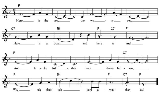 Our boat is gliding, gliding, gliding, Our boat gliding o'er the water, Our boat is gliding, gliding, gliding, Our boat is gliding o'er the sea. The ukuleles, the ukuleles, Are sounding gently o’er the water, The ukuleles, the ukuleles, Are sounding gently o'er the sea. |