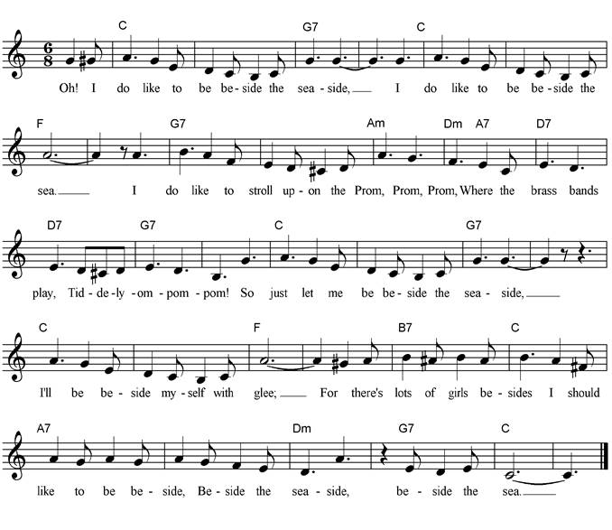 Oh! I do like to be beside the seaside, I do like to be beside the sea. I do like to stroll upon the Prom, Prom, Prom, Where the brass bands play Tiddely-om-pom-pom! So just let me be beside the seaside, I'll be beside myself with glee; For there's lots of girls besides I should like to be beside, Beside the seaside, beside the sea. |