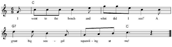 I went to the beach and what did I see? A great big seagull squawking at me! I went to the beach and what did I see? A fish in a rock pool splashing near me! I went to the beach and what did I see? A shell in the water sparkling at me! I went to the beach and what did I see? A crab on the seashore waving me! I went to the beach and what did I see? Children in sunhats just like ME! |