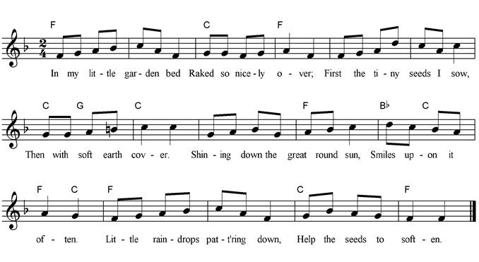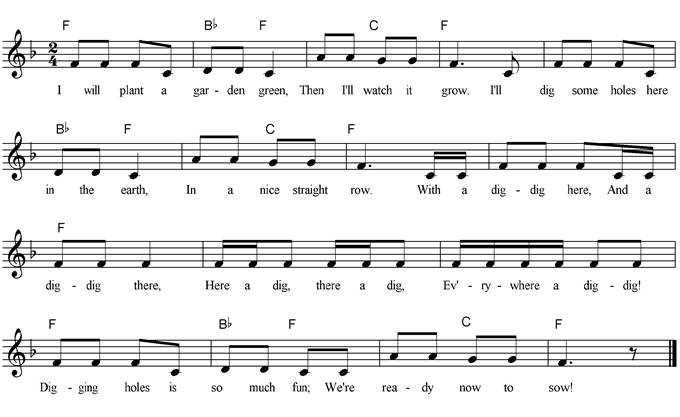 I will plant a garden green, Then I'll watch it grow. I'll dig some holes here in the earth, In a nice straight row. With a dig-dig here, And a dig-dig there, Here a dig, there a dig, Everywhere a dig-dig, Digging holes is so much fun; We’re ready now to sow! I will plant a garden green, Then I'll watch it grow. In each hole I'll drop a seed, In each hole row by row. With a drop-drop here, And a drop-drop there, Here a drop, there a drop, Everywhere a drop-drop, Planting seeds is so much fun Just watch them sprout and grow! I will plant a garden green, Then I'll watch it grow. I'll water each plant one by one, They'll sprout up in a row. With a squirt-squirt here, And a squirt-squirt there, Here a squirt, there a squirt, Everywhere a squirt-squirt, Watering plants is so much fun Just watch them grow and grow! |