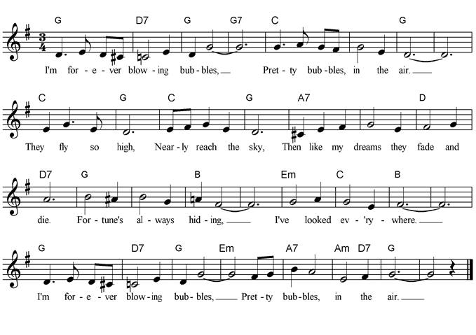 I'm forever blowing bubbles, Pretty bubbles in the air. They fly so high, Nearly reach the sky, Then like my dreams they fade and die. Fortune's always hiding, I've looked everywhere. I'm forever blowing bubbles, Pretty bubbles in the air. |