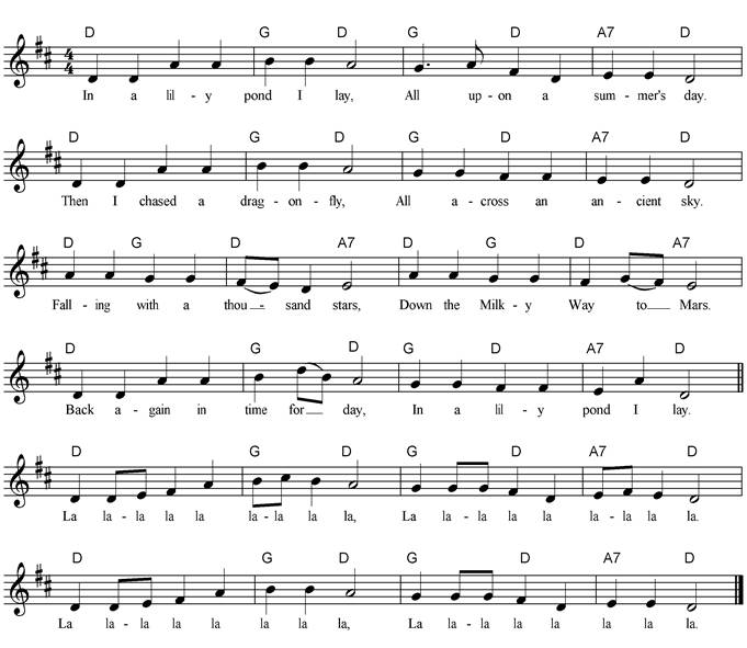 All upon a summer's day. Then I chased a dragonfly, All across an ancient sky. Falling with a thousand stars, Down the Milky Way to Mars. Back again in time for day, In a lily pond I lay. La lala la la lala la la, La lala la la la la la. La lala la la lala la la, La lala la la la la la. |