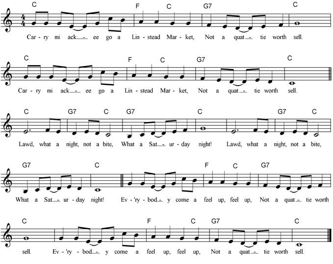 Carry mi ackee, go a Linstead Market, Not a quattie worth sell. Carry me ackee, go a Linstead Market, Not a quattie worth sell. Chorus: Lawd, what a night, not a bite, What a Saturday night! Lawd, what a night not a bite What a Saturday night! Everbody come a feel up, feel up, Not a quattie worth sell. Everybody come a feel up, feel up, Not a quattie worth sell. Lady come and buy nice fresh ackee, They are tasty to eat. Lady come and buy nice fresh ackee, They are tasty to eat. |