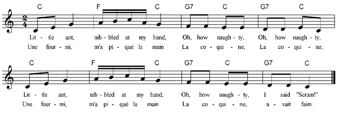 La fourmi m'a piqué la main La coquine, la coquine La fourmi m'a piqué la main La coquine, elle avait faim Little ant nibbled at my hand, Oh, how naughty, oh, how naughty, Little ant nibbled at my hand, Oh, how naughty, I said, “Scram!” Then a bee tried to sting my ear, Oh, how naughty, oh, how naughty, Then a bee tried to sting my ear, Oh, how naughty, “Sleepy little bee!” Hairy spider jumped upon my nose, Oh, how naughty, oh, how naughty, Hairy spider jumped upon my nose, Oh, how naughty, “Off you go!” Next a wasp tried to sting my chin, Oh, how naughty, oh, how naughty, Next a wasp tried to sting my chin, Oh, how naughty, “You won’t win!” And a bird tried to peck my back, Oh, how naughty, oh, how naughty, And a bird tried to peck my back, So I pecked that sparrow back! La fourmi m'a piqué la main La coquine, la coquine La fourmi m'a piqué la main La coquine, elle avait faim L'araignée m'a piqué le nez La coquine, la coquine6 L'araignée m'a piqué le nez La coquine, elle était fâchée Et l'abeille m'a piqué l'oreille La coquine, la coquine Et l'abeille m'a piqué l'oreille La coquine n'avait pas sommeil Le bourdon m'a piqué le menton Le coquin, le coquin Le bourdon m'a piqué le menton Le coquin voulait un bonbon Et l'oiseau m'a piqué le dos Le coquin, le coquin Et l'oiseau m'a piqué le dos Le coquin était un moinea |
