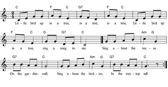Little bird up in a tree, in a tree, in a tree, Little bird up in a tree, sing a song to me. Sing about the roses, on the garden wall; Sing about the birdies, in the tree-top tall. Sing about the farmer, planting beans and corn, Planting peas and carrots, on the summer morn. Sing about the mountain, sing about the sea, Sing about the rainbow, sing a song for me. |