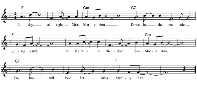 All day, all night, Miss Mary Ann, Down by the seaside, sifting sand, All the little children love Mary Ann, You too, will love her, Miss Mary Ann. If you come to this island fine, You'll love the sea and bright sunshine, You will be enchanted with this fair land, You'll be bewitched by Miss Mary Ann. |
