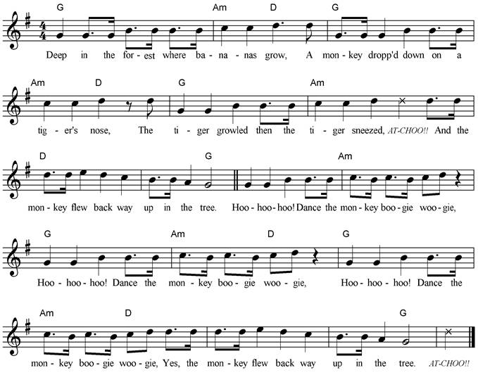 Deep in the forest where bananas grow, A monkey dropped down on a tiger’s nose, The tiger growled then the tiger sneezed, “ATCHOO!!” And the monkey flew back way up in the tree. Hoo-hoo-hoo! Dance the monkey boogie woogie, Hoo-hoo-hoo! Dance the monkey boogie woogie, Hoo-hoo-hoo! Dance the monkey boogie woogie, Yes, the monkey flew back way up in the tree. “ATCHOO!!” |