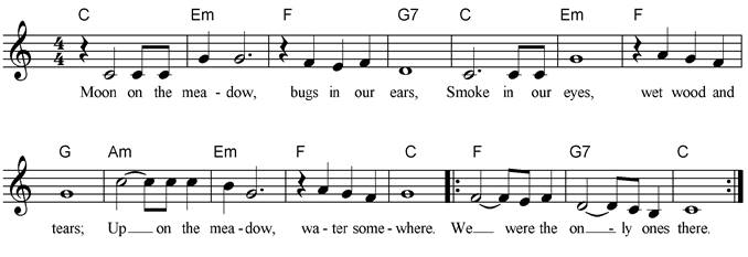 Chorus: Moon on the meadow, bugs in our ears, Smoke in our eyes,wet wood and tears, Up on the meadow, water somewhere, We were the only ones there. Wild horses rushing, dry lakes to peaks, Finding the love there that everyone seeks. Hiking to rainbows, sunset and stars, Just finding out who we are. Chorus We will return here one lucky day, Our hearts will guide us, they know the way. People in cities don’t understand, Falling in love with the land. Moon on the meadow, bugs in our ears, Smoke in our eyes,wet wood and tears, Up on the meadow, water somewhere, With you my friend I am there. |