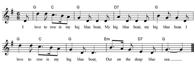 I love to row in my big blue boat, My big blue boat, my big blue boat. I love to row in my big blue boat, Out on the deep blue sea. My big blue boat has two red sails, Two red sails, two red sails, My big blue boat has two red sails, Out on the deep blue sea. My big blue boat goes up and down, Up and down, up and down, My big blue boat goes up and down, Out on the deep blue sea. My big blue boat goes from side to side, Side to side, side to side, My big blue boat goes from side to side, Out on the deep blue sea. So come with me in my big blue boat, My big blue boat, my big blue boat. So come with me in my big blue boat, Out on the deep blue sea. We’ll catch a fish in my big blue boat, My big blue boat, my big blue boat. We’ll catch a fish in my big blue boat, And take it home for tea! |