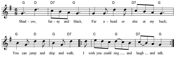 Shadow, funny and black, Far ahead or else at my back, You can jump and skip and walk; I wish you could sing and laugh and talk. |