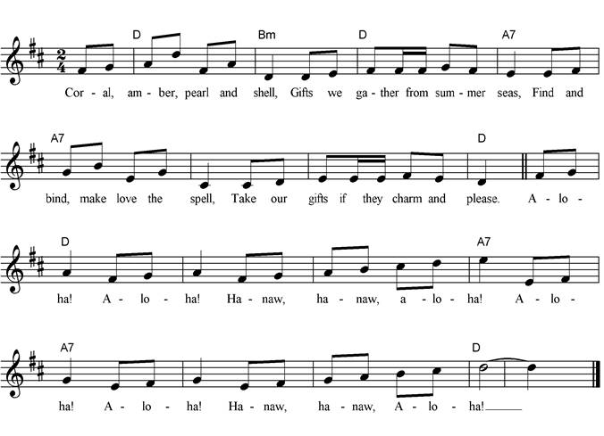 Coral, amber, pearl and shell, Gifts we gather from summer seas, Find and bind make love the spell, Take our gifts if they charm and please. Chorus: Aloha! Aloha! Hanaw, hanaw, aloha! Aloha! Aloha! Hanaw, hanaw, Aloha! Ruby, onyx, rain and dew, Weave a crown with your jewelled light, Show and know whose world is new, Who is prince of the day and night. Meadow, orchard, field and vine. Melon, grape and maize are here, Leaf and sheaf with tendrils twine, Bring your harvests far and near. Mountains, flowers, trees and hills, Laugh and sing where such blessings fall, Wind and waves, lagoons and rills, Shout our love for the Lord of all. |