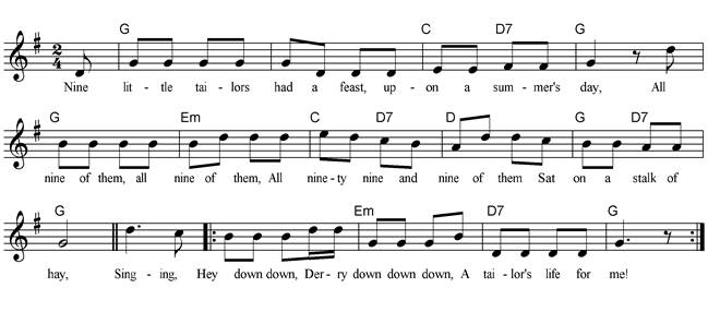Nine little tailors had a feast, Upon a summer’s day, All nine of them, all nine of them, All ninety-nine and nine of them Sat on a stalk of hay, Singing, Hey down, down, Derry down down down, A tailor’s life for me! Repeat And when the splendid feast was done, They all began to sing, All nine of them, all nine of them, All ninety-nine and nine of them They danced round in a ring, Singing, Hey down, down, Derry down down down, They danced round in a ring.