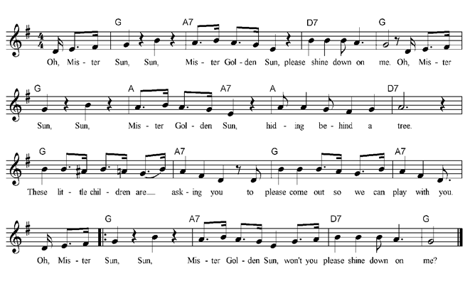 Oh, Mister Sun, Sun, Mister Golden Sun, please shine down on me. Oh, Mister Sun, Sun, Mister Golden Sun, hiding behind a tree. These little children are asking you, to please come out so we can play