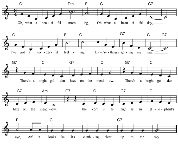 Chorus: Oh what a beautiful morning, Oh what a beautiful day, I've got a wonderful feeling, Everything's going my way. There's a bright golden haze on the meadow, There's a bright golden haze on the meadow, The corn is as high as an elephant's eye, An' it looks like its climbin' clear up to the sky. Chorus All the cattle are standing like statues, All the cattle are standing like statues, They don't turn their heads as they see me ride by. But a little brown mav'rick is winking her eye. Chorus All the sounds of the earth are like music, All the sounds of the earth are like music, The breeze is so busy it don't miss a tree, And an ol' Weepin' Willer is laughin' at me. Chorus |