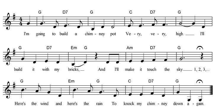 I’m going to build a chimney pot Very, very high. I’ll build it with my bricks, And I’ll make it touch the sky – 1, 2, 3…. Here’s the wind and here’s the rain To knock my chimney down again. |