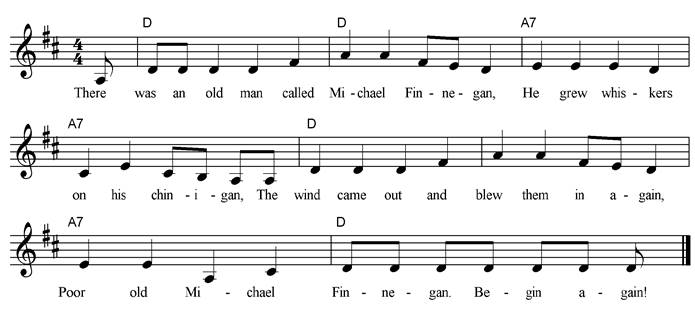 There was an old man named Michael Finnegan, He grew whiskers on his chin-i-gan, The wind came out and blew them in again, Poor old Michael Finnegan. Begin again! There was an old man named Michael Finnegan, He went fishing with a pin-a-gan, Caught a fish and dropped it in again, Poor old Michael Finnegan. Begin again! There was an old man named Michael Finnegan, He fell down and broke his shin-i-gan, Folks said ‘Mike, you’ll never swim again’, Poor old Michael Finnegan. Begin again! There was an old man named Michael Finnegan, He grew fat and then grew thin again, Then he died, and had to begin again, Poor old Michael Finnegan. Begin again! |