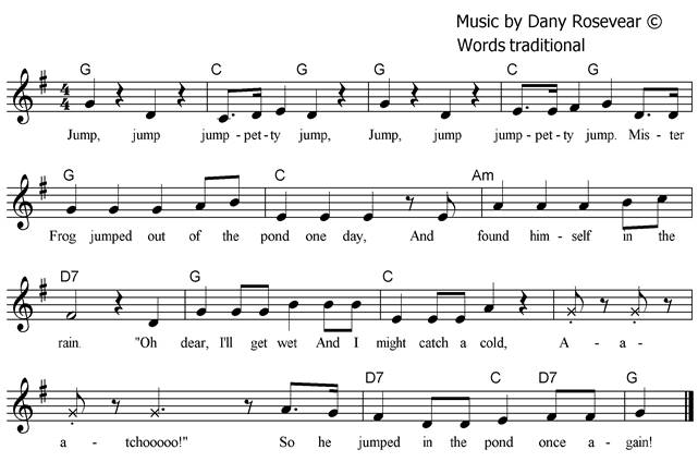 Jump, jump jumpetty jump, Jump, jump jumpetty jump. Mr. Frog jumped out of the pond one day, And found himself in the rain. “Oh dear, I’ll get wet And might catch a cold, A-a-a-tchooooo! So he jumped in the pond once again! |