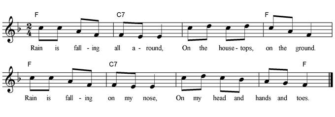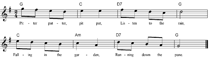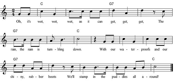 Pitter patter, pit pat, Listen to the rain, Falling in the garden, Running down the pane. Pitter patter, pit pat, Where can be the sun? Do you think it’s hiding, Hiding just for fun? Pitter patter, pit pat, It was just a shower, Washing all the green