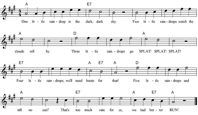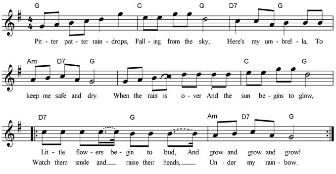 Pitter patter raindrops, Falling from the sky; Here's my umbrella, To keep me safe and dry, When the rain is over, And the sun begins to