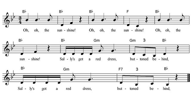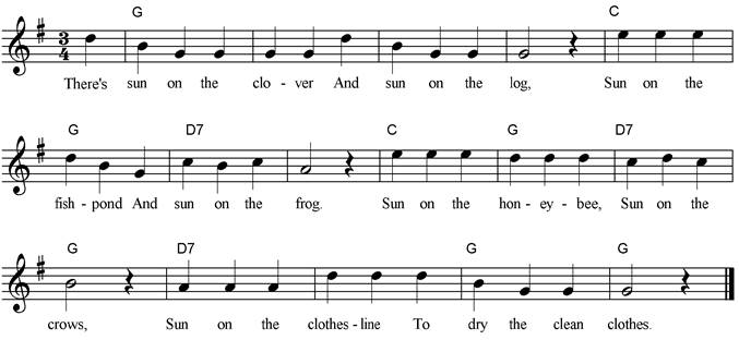 There's sun on the clover And sun on the log, Sun on the fish pond And sun on the frog. Sun on the honeybee, Sun on the crows, Sun on the clothesline To dry the clean clothes. |