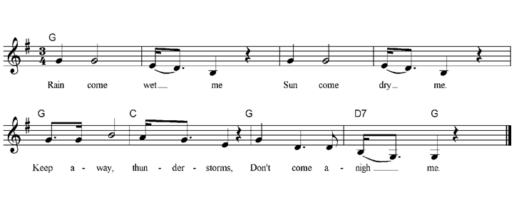 Rain come wet me, Sun come dry me. Keep away, thunderstorms, Don’t come a-nigh me. Rain come wet me, Sun come dry me. Fly my way, snowy days, Down, down, right by me. |
