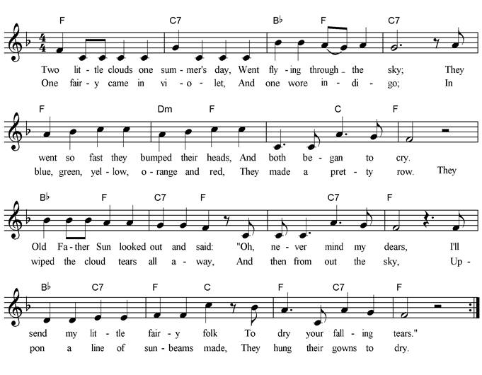It’s raining, raining, raining, It’s falling all around, It’s raining on my head, And it’s raining on the ground. Seedlings, saplings, little birds, Each living thing nearby, Will catch the cool, clean water Falling freely from the sky. Running, running, running, It runs off merrily, Down the streams and rivers, Then rushing out to sea. Warming, warming, warming. The sun shines on the sea, Evaporates the water, To rise up silently. Rising, rising, rising, Up, up in the air, Those tiny drops of water, Form the clouds we see up there. Floating, floating, floating, Way over mountains high, Over towns and cities, The clouds go passing by! It’s raining, raining, raining, It’s falling all around, It’s raining on my head, And it’s raining on the ground. |