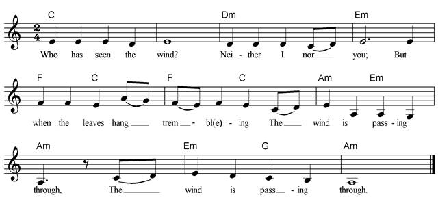 Who has seen the wind? Neither you nor I nor you; But when the leaves hang trembling, The wind is passing through, The wind is passing through. Who has seen the wind? Neither you nor I; But when the trees bow down their heads, The wind is passing by, The wind is passing by. |