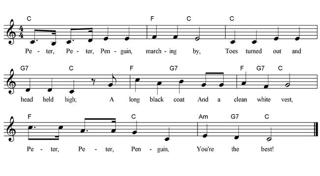 Peter, Peter Penguin, marching by, march in place Toes turned out and head held high; waddle with feet at ten to