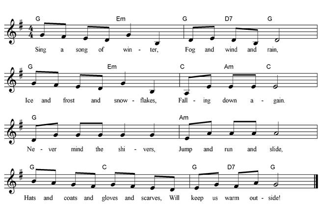 Sing a song of winter, Fog and wind and rain, Ice and frost and snowflakes, Falling down again; Never mind the shivers, Jump and run and slide, Hats and coats and gloves and scarves, Will keep us warm outside! |