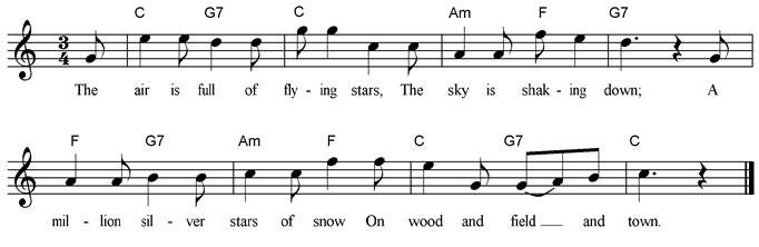 The air is full of flying stars The sky is shaking down; A million silver stars of snow On wood and field and town. |