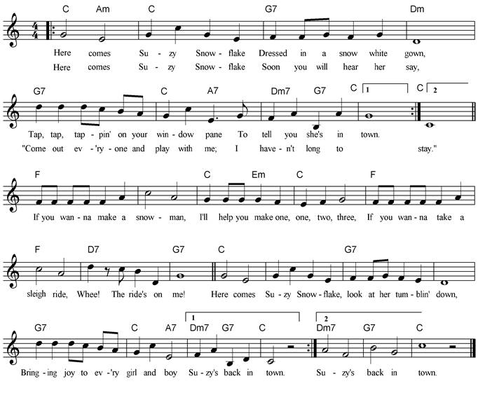 pane To tell you she's in town. Here comes Suzy Snowflake Soon you will hear her say, “Come out ev'ryone and play with
