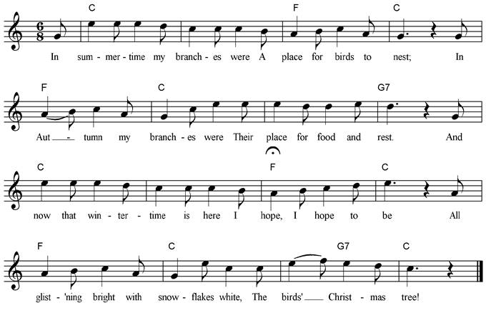 In summertime my branches were A place for birds to nest; In autumn my branches were Their place for food and rest. And now that wintertime is here I hope - I hope to be All glistening bright with
