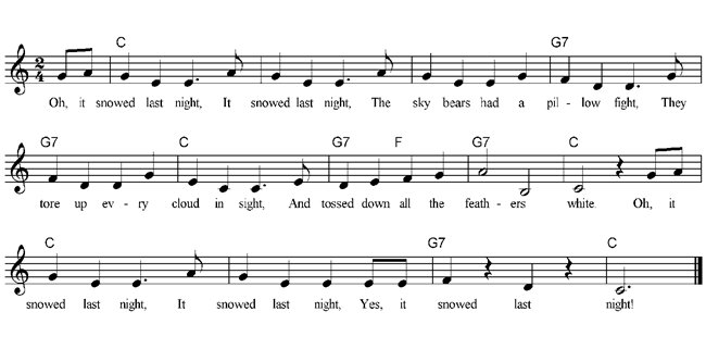 Oh, it snowed last night, It snowed last night, The sky bears had a pillow fight, They tore up every cloud in sight, And tossed down all the feathers white. Oh, it snowed last night, It snowed last night, Yes, it snowed last night! Oh, it snowed last night, It snowed last night, We woke to see the garden white, And ran outside in such delight, Quite ready for a snowball fight. Oh, it snowed last night, It snowed last night, Yes, it snowed last night! |