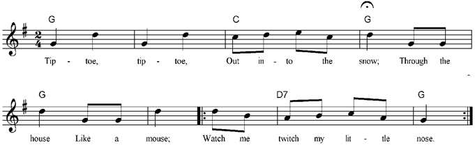 Tiptoe, tiptoe, Out into the snow; Through the house Like a mouse; Watch me twitch my little nose. x2 Tiptoe, tiptoe, In the soft white snow; Not a sound All around Not a soul can hear me go! x2 Tiptoe, tiptoe, Creep back in the house Through the door, On the floor, Sitting quiet as a mouse. x2 |