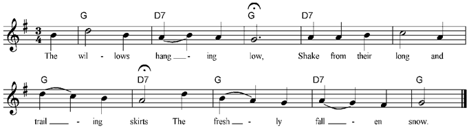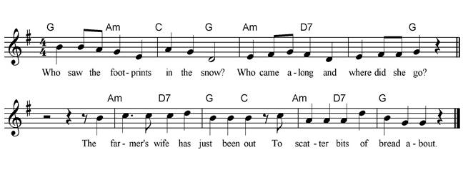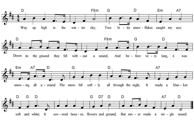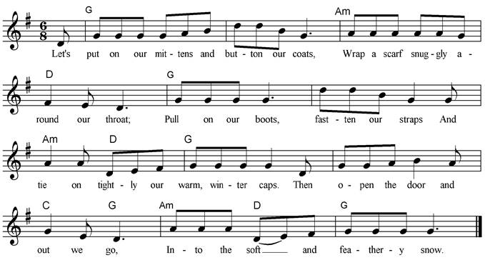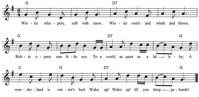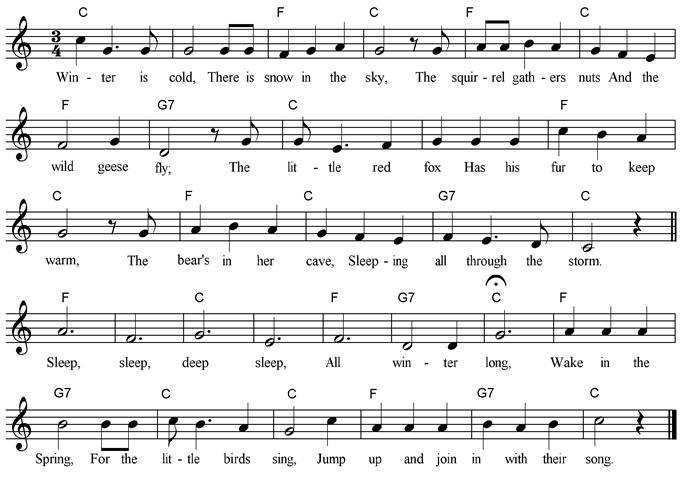 There is snow in the sky, The squirrel gathers nuts And the wild geese fly; The little red fox, Has his fur to keep warm, The bear's in her cave, Sleeping all through the storm. Sleep, sleep, deep sleep, all winter long, Wake up in the Spring, for the little birds sing, Jump up and join in with their song. |