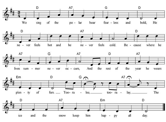 We sing of the polar bear fearless and bold. He never feels hot and he never feels cold, Because where he lives summer never occurs, And the rest of the year he wears plenty of furs. Tooralee, tooralay, The ice and the snow keep him happy all day. We sing of the polar bear fearless and bold. He never feels hot and he never feels cold, He dives in the water with a splash! and a splish! Catching silvery fish it’s his favourite dish. Toora lee, toora lay, The ice and the snow keep him happy all day. |