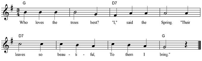 Who loves the trees best? “I,” said the spring, “Their leaves so beautiful To them I bring.” Who loves the trees best? “I,” summer said, “I give them blossoms, White, yellow, red.” Who loves the trees best? “I,” said the fall, “I give luscious fruits, Bright tints to all!” Who loves the trees best? “I love them best,” Harsh winter answered, “I give them rest.” |