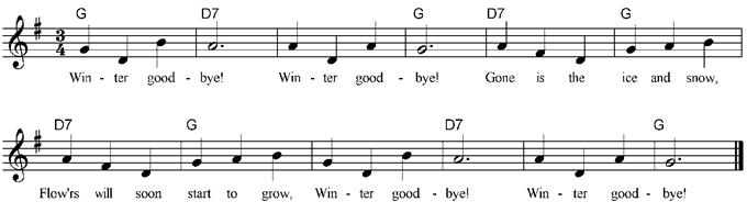 Winter goodbye! Winter goodbye! Gone is the ice and snow, Flowers will soon start to grow, Winter goodbye! Winter goodbye! Winter goodbye! Winter goodbye! You may no longer stay; Springtime is on it’s way, Winter goodbye! Winter goodbye! |