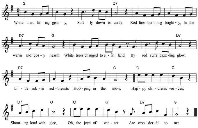 elfin-land, By red sun's dazzling glow, Little robin redbreasts Hopping in the snow. Happy children's voices, Shouting loud with glee, Oh! the joys of winter Are wonderful to me. |