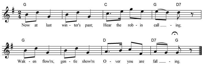 Now at last winter’s past Hear the robin calling Waken flowers, gentle showers Over you are falling Down below quilts of snow Long have you been lying; Now come out, look about, Soft the winds are sighing. Lift your heads from your beds, Rise and round you glancing, See where May comes today From the southland dancing. |