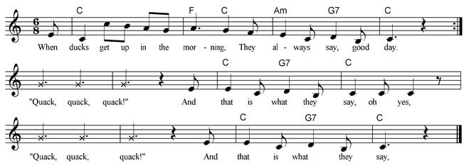 this cheerful song. Listen at: http://www.nancymusic.com/Ducksplay.htm . Watch at: http://wiki.kcls.org/tellmeastory/index.php/When_Animals_Get_Up_in_the_Morning