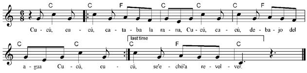 translation is very free to allow the song to rhyme and be sung in English. As an alternative to walking round sit and clap to each ‘cu’cu’ or play an instrument. Listen at: http://www.youtube.com/watch?v=7x_5QgE2_Do&feature=related