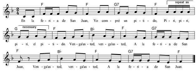En la feria de San Juan O Another cumulative song . Instead of playing instruments introduce vigorous movements: marchando… saltando... bailando...gateando etc. for a more active game. Find a similar song ‘En la pulga de San Jose’ ‘In the flea market of San Jose’ at: http://www.youtube.com/watch?v=yPINbs0CQhc&feature=related