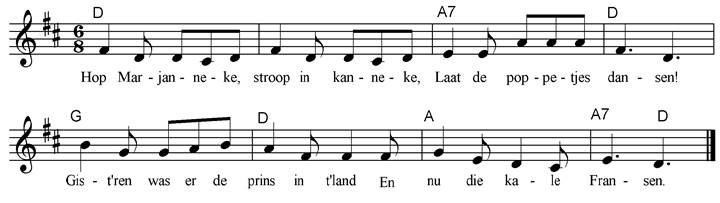 Hop Marjanneke, stroop in het kanneke, Laat de poppetjes dansen, Gisteren was de prins in het land, En nu die kale Fransen. Hop